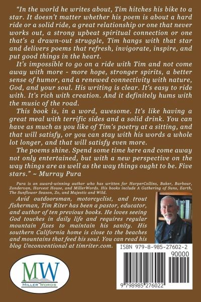 In the world he writes about, Tim hitches his bike to a star. It doesn't matter whether his poem is about a hard ride or a solid ride, a great relationship or one that never works out, a strong upbeat spiritual connection or one that's a drawn-out struggle, Tim hangs with that star and delivers poems that refresh, invigorate, inspire, and put good things in the heart. It's impossible to go on a ride with Tim and not come away with more - more hope, stronger spirits, a better sense of humor, and a renewed connectivity with nature, God, and your soul. His writing is clear. It's easy to ride with. It's rich with creation. And it definitely hums with the music of the road. This book is, in a word, awesome. It's like having a great meal with terrific sides and a solid drink. You can have as much as you like of Tim's poetry at a sitting, and that will satisfy, or you can stay with his words a whole lot longer, and that will satisfy even more. The poems shine. Spend some time here and come away not only entertained, but with a new perspective on the way things are as well as the way things ought to be. Five stars. Murray Pura is an award-winning author. His books include A Gathering of Suns, Earth, The Sunflower Season, Zo, and Majestic and Wild.