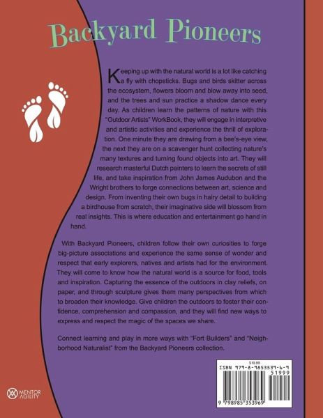 Keeping up with the natural world is a lot like catching a fly with chopsticks. Bugs and birds skitter across the ecosystem, flowers bloom and blow away into seed, and the trees and sun practice a shadow dance every day. As children learn the patterns of nature with this "Outdoor Artists" WorkBook, they will engage in interpretive and artistic activities and experience the thrill of exploration. One minute they are drawing from a bee's-eye view, the next they are on a scavenger hunt collecting nature's many textures and turning found objects into art. They will research masterful Dutch painters to learn the secrets of still life, and take inspiration from John James Audubon and the Wright brothers to forge connections between art, science and design. From inventing their own bugs in hairy detail to building a birdhouse from scratch, their imaginative side will blossom from real insights. This is where education and entertainment go hand in hand. With Backyard Pioneers, children follow their own curiosities to forge big-picture associations and experience the same sense of wonder and respect that early explorers, natives and artists had for the environment. They will come to know how the natural world is a source for food, tools and inspiration. Capturing the essence of the outdoors in clay reliefs, on paper, and through sculpture gives them many perspectives from which to broaden their knowledge. Give children the outdoors to foster their confidence, comprehension and compassion, and they will find new ways to express and respect the magic of the spaces we share.