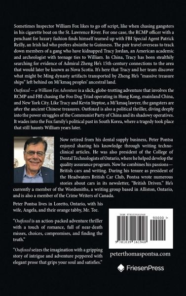 Sometimes Inspector William Fox likes to go off script, like when chasing gangsters in his cigarette boat on the St. Lawrence River. For one case, the RCMP officer with a penchant for luxury fashion finds himself teamed up with FBI Special Agent Patrick Reilly, an Irish lad who prefers absinthe to Guinness. The pair travel overseas to track down members of a gang who have kidnapped Tracy Jordan, an American academic and archeologist with teenage ties to William. In China, Tracy has been stealthily searching for evidence of Admiral Zheng He's 15th-century connections to the area that would later be known as Nova Scotia. It's here that Tracy and her team discover what might be Ming dynasty artifacts transported by Zheng He's "massive treasure ships" left behind on Mi'kmaq peoples' ancestral land. Outfoxed - a William Fox Adventure is a slick, globe-trotting adventure that involves the RCMP and FBI chasing the Foo Dog Triad operating in Hong Kong, mainland China, and New York City. Like Tracy and Kevin Steptoe, a Mi'kmaq lawyer, the gangsters are after the ancient Chinese treasures. Outfoxed is also a political thriller, diving deeply into the power struggles of the Communist Party of China and its shadowy operatives. It wades into the Fox family's political past in South Korea, where a tragedy took place that still haunts William years later.
