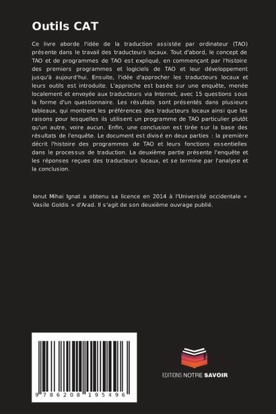 Ce livre aborde l'idée de la traduction assistée par ordinateur (TAO) présente dans le travail des traducteurs locaux. Tout d'abord, le concept de TAO et de programmes de TAO est expliqué, en commençant par l'histoire des premiers programmes et logiciels de TAO et leur développement jusqu'à aujourd'hui. Ensuite, l'idée d'approcher les traducteurs locaux et leurs outils est introduite. L'approche est basée sur une enquête, menée localement et envoyée aux traducteurs via Internet, avec 15 questions sous la forme d'un questionnaire. Les résultats sont présentés dans plusieurs tableaux, qui montrent les préférences des traducteurs locaux ainsi que les raisons pour lesquelles ils utilisent un programme de TAO particulier plutôt qu'un autre, voire aucun. Enfin, une conclusion est tirée sur la base des résultats de l'enquête. Le document est divisé en deux parties : la première décrit l'histoire des programmes de TAO et leurs fonctions essentielles dans le processus de traduction. La deuxième partie présente l'enquête et les réponses reçues des traducteurs locaux, et se termine par l'analyse et la conclusion.