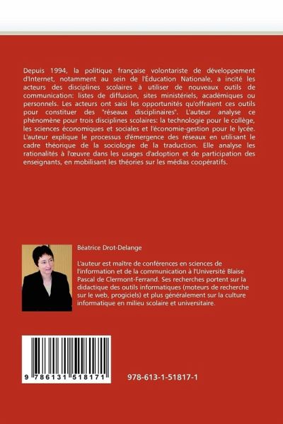 Depuis 1994, la politique française volontariste de développement d'Internet, notamment au sein de l'Éducation Nationale, a incité les acteurs des disciplines scolaires à utiliser de nouveaux outils de communication: listes de diffusion, sites ministériels, académiques ou personnels. Les acteurs ont saisi les opportunités qu'offraient ces outils pour constituer des "réseaux disciplinaires". L'auteur analyse ce phénomène pour trois disciplines scolaires: la technologie pour le collège, les sciences économiques et sociales et l'économie-gestion pour le lycée. L'auteur explique le processus d'émergence des réseaux en utilisant le cadre théorique de la sociologie de la traduction. Elle analyse les rationalités à l' uvre dans les usages d'adoption et de participation des enseignants, en mobilisant les théories sur les médias coopératifs.