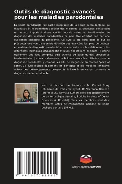 La santé parodontale fait partie intégrante de la santé bucco-dentaire. Le diagnostic et le traitement adéquat des maladies parodontales constituent un aspect important d'une cavité buccale saine et fonctionnelle. Le diagnostic des maladies parodontales ne peut être effectué que par une évaluation complète du parodonte. Ce livre a été écrit dans le but de présenter une vue d'ensemble détaillée des avancées les plus pertinentes en matière de diagnostic parodontal et se concentre sur la relation entre les différentes techniques dediagnostic et leurs applications cliniques. Il donne également une idée complète dela science de base et des procédures fondamentales jusqu'aux dernières techniques avancées utilisées pour le diagnostic parodontal, y compris les kits de diagnostic au fauteuil "point of care". Ce livre élucide également les concepts et les modèles innovants autour des développements prospectifs à l'avenir en ce qui concerne le diagnostic de la parodontite .