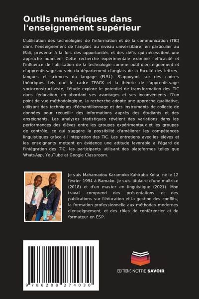 L'utilisation des technologies de l'information et de la communication (TIC) dans l'enseignement de l'anglais au niveau universitaire, en particulier au Mali, présente à la fois des opportunités et des défis qui nécessitent une approche nuancée. Cette recherche expérimentale examine l'efficacité et l'influence de l'utilisation de la technologie comme outil d'enseignement et d'apprentissage au sein du département d'anglais de la Faculté des lettres, langues et sciences du langage (FLSL). S'appuyant sur des cadres théoriques tels que le cadre TPACK et la théorie de l'apprentissage socioconstructiviste, l'étude explore le potentiel de transformation des TIC dans l'éducation, en abordant ses avantages et ses inconvénients. D'un point de vue méthodologique, la recherche adopte une approche qualitative, utilisant des techniques d'échantillonnage et des instruments de collecte de données pour recueillir des informations auprès des étudiants et des enseignants. Les analyses statistiques révèlent des variations dans les performances des élèves entre les groupes expérimentaux et les groupes de contrôle, ce qui suggère la possibilité d'améliorer les compétences linguistiques grâce à l'intégration des TIC. Les entretiens avec les élèves et les enseignants mettent en évidence une attitude favorable à l'égard de l'intégration des TIC, les participants utilisant des plateformes telles que WhatsApp, YouTube et Google Classroom.