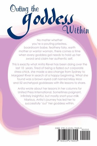 No matter whether you're a pouting priestess, boardroom babe, feathery fairy, earth mother or warrior woman, there comes a time when every goddess gal needs to hold up her sword and claim her authentic self. This is exactly what Anita Revel has been doing over the last 10 years. Tired of being a fizzled out corporate stress-chick, she made a sea change from Sydney to Margaret River in search of a happy beginning. What she found instead was a brown-eyed calf named Missy Moo and 52 archetypal goddesses with life lessons to share. Anita wrote about her lessons in her columns for United Press International. Sometimes poignant, infinitely insightful, but mostly snort-your-milk hilarious, Anita's journey has led her to successfully 'out' her goddess within.