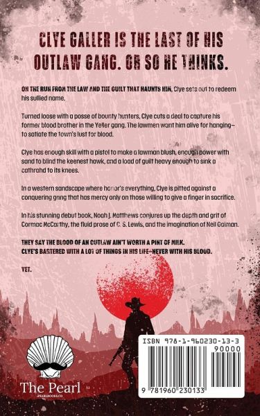 Clye Galler is the last of his outlaw gang. Or so he thinks. On the run from the law and the guilt that haunts him, Clye sets out to redeem his sullied name. Turned loose with a posse of bounty hunters, Clye cuts a deal to capture his former blood brother in the Yeller gang. The lawmen want him alive for hanging-to satiate the town's lust for blood. Clye has enough skill with a pistol to make a lawman blush, enough power with sand to blind the keenest hawk, and a load of guilt heavy enough to sink a cathrahd to its knees. In a western sandscape where honor's everything, Clye is pitted against a conquering gang that has mercy only on those willing to give a finger in sacrifice. In his stunning debut book, Noah J. Matthews conjures up the depth and grit of Cormac McCarthy, the fluid prose of C.S. Lewis, and the imagination of Neil Gaiman. They say the blood of an outlaw ain't worth a pint of milk. Clye's bartered with a lot of things in his life-never with his blood. Yet.