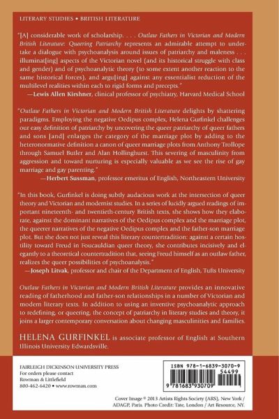 Outlaw Fathers in Victorian and Modern British Literature: Queering Patriarchy traces the representations of outlaw fathers, or queer patriarchs, and their relationships with their queer sons, in a particular literary tradition: mid-to-late-Victorian and twentieth-century British fiction and memoir. Specifically, I look at such representations in Anthony Trollope's Doctor Thorne (1858) and The Prime Minister (1875-76) (while also drawing on An Autobiography (1883) and The Duke's Children (1880)); Samuel Butler's The Way of All Flesh (published in 1901), Henry James's "The Lesson of the Master" (1888), J. R. Ackerley's My Father and Myself (written in the 1930s and published in 1968), E. M. Forster's "Little Imber" (1961) (with an occasional detour into The Longest Journey (1907), Howards End (1909), and Maurice (published in 1971)), and Alan Hollinghurst's The Spell (1998). In the coda, I consider the implications of including transgender, transnational female-to-male fathers of color in the ranks of queer patriarchy and discuss two contemporary novels, Jackie Kay's Trumpet (1998, Scotland) and Patricia Powell's The Pagoda (1998, Jamaica and the United States), as well as-briefly-an episode an episode of the television show The L-Word (2008) and the documentary U-People (2007). The term "queer patriarchy" has two components. The first one is a non-traditional, primarily-but not exclusively-non-heterosexual, pervasively present, and culturally important, paternal subjectivity. The second one is the bond between such queer paternal figures and their sons, biological and non-biological. This study pays attention primarily to the relationship between psyche, language, and ideology, but it will join a larger conversation about the changing roles of men in general and fathers in particular, which is taking place outside of the field of literary studies.