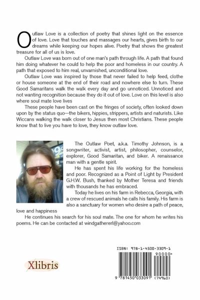 Outlaw Love is a collection of poetry that shines light on the essence of love. Love that touches and massages our hearts, gives birth to our dreams while keeping our hopes alive. Poetry that shows the greatest treasure for all of us is love. Outlaw Love was born out of one man's path through life. A path that found him doing whatever he could to help the poor and homeless in our country. A path that exposed to him real, unvarnished, unconditional love. Outlaw Love was inspired by those that never failed to help feed, clothe or house someone at the end of their road and nowhere else to turn. These Good Samaritans walk the walk every day and go unnoticed. Unnoticed and not wanting recognition because they do it out of love. Love on this level is also where soul mate love lives These people have been cast on the fringes of society, often looked down upon by the status quo-the bikers, hippies, strippers, artists and naturists. Like Wiccans walking the walk closer to Jesus then most Christians. These people know that to live you have to love, they know outlaw love.