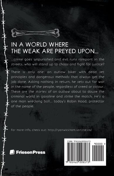 IN A WORLD WHERE THE WEAK ARE PREYED UPON... ...crime goes unpunished and evil runs rampant in the streets, who will stand up to chaos and fight for justice? There is only one: an outlaw biker with dead set principles and dangerous methods that always get the job done. Asking nothing in return, he sets out for war in the name of the people, regardless of creed or colour. These are the stories of an outlaw about to douse the criminal world in gasoline and strike the match. He's a one man wrecking ball... today's Robin Hood, protector of the people. For more info, check out: http://ryanwickham.k0nline.com