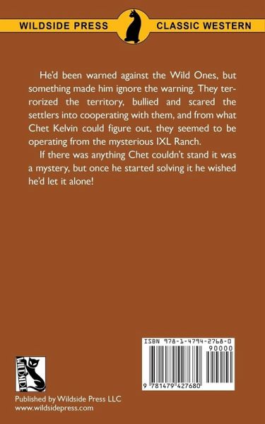 He'd been warned against the Wild Ones, but something made him ignore the warning. They terrorized the territory, bullied and scared the settlers into cooperating with them, and from what Chet Kelvin could figure out, they seemed to be operating from the mysterious IXL Ranch. If there was anything Chet couldn't stand it was a mystery, but once he started solving it he wished he'd let it alone.