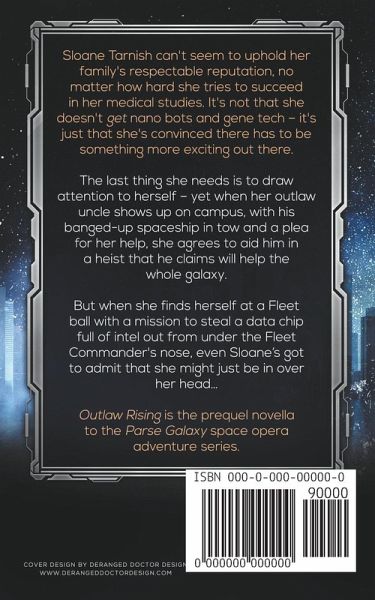 Sloane Tarnish has always secretly admired her outlaw of an uncle and his tales of not-so-legal adventures across the galaxy–but she never thought she'd be asked to help with one of his heists. When Uncle Vin shows up on her med school campus with a plan to steal a chip full of Fleet intelligence–and the baffling idea to have her play a key role in the scheme–Sloane's got her doubts. Uncle Vin doesn't seem to realize that her top skills involve the kind of shots you drink, not the ones you fire. But Vin's convinced the Fleet's got plans to install empirical rule across the free galaxy, and that this data could stop them before they can begin. When a bunch of rogue delivery drones start taking shots at her–and not the liquid kind–she has to figure he's onto something. To prove it, all she needs to do is steal the data key from the middle of a Fleet ball… and right out from under the Commander's nose. Too bad she's got absolutely no idea what she's doing… Outlaw Rising is the prequel novella to the Parse Galaxy space opera adventure series.