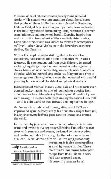 Memoirs of celebrated criminals purvey vivid personal stories while spawning sharp questions about the cultures that produced them. In Outlaw: Author Armed & Dangerous, Rédoine Faïd, of Algerian immigrant parents, born and raised in the housing projects surrounding Paris, recounts his career as an infamous and renowned bandit. Drawing inspiration and instruction from a host of films and television series, Faïd styled himself and was known to friends and accomplices as "Doc" — after Steve McQueen in the legendary suspense thriller, The Getaway. With self-discipline and a striking ability to learn from experience, Faïd carried off his first robberies while still a teenager. He soon graduated from petty thievery to armed robbery, targeting computer component suppliers, jewelry stores, banks, and most memorably, armored trucks. A master of disguise, with bulletproof vest and a .357 Magnum as a prop to encourage compliance, he led a crew that operated with careful planning but eschewed bloodshed and physical violence. In imitation of Michael Mann’s Heat, Faïd and his cohorts donned hockey masks for one job, sometimes even quoting from other famous heist films during their capers. When bold plans went wrong, he reacted with fast thinking that served him well — until it didn’t, and he was arrested and imprisoned in 1998. Outlaw was first published in France in 2009, after which Faïd was imprisoned again. Subsequently, his dramatic escapes from jail, in 2013 and 2018, made front-page news in France and around the world. Interviewed by journalist Jérôme Pierrat, who specializes in crime and investigative reportage, Rédoine Faïd tells his own story with panache and humor, darkened by introspection and cautionary tales. His story, like that of a character out of a Jean-Pierre Melville film or Dassin’s Rififi, is not only intriguing, it is also as compelling as any high-grade thriller. Three months after his daring helicopter escape from Réau Prison in 2018, Faïd was captured again. He currently remains in jail.