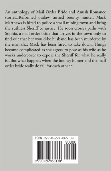 An anthology of Mail Order Bride and Amish Romance stories...Reformed outlaw turned bounty hunter, Mack Matthews is hired to police a small mining town and bring the ruthless Sheriff to justice. He soon crosses paths with Sophia, a mail order bride that arrives in the town only to find out that her would-be husband has been murdered by the man that Mack has been hired to take down. Things become complicated as she agrees to pose as his wife as he works undercover to expose the Sheriff for what he really is...But what happens when the bounty hunter and the mail order bride really do fall for each other?