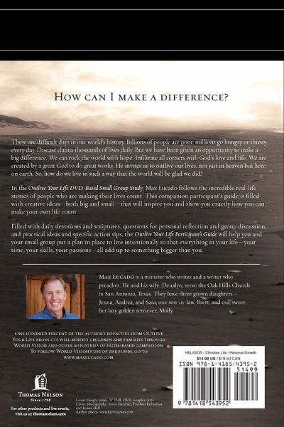 Everyone wants to know that their time on earth has some significance. We all want to make a difference. These are difficult days in our world's history. Billions of people are poor, millions go hungry or thirsty every day. Disease claims thousands of lives daily. But you and I have been given an opportunity to make a big difference. What if we did? What if we rocked the world with hope? Infiltrated all corners with God's love and life? We are created by a great God to do great works. He invites us to outlive our lives, not just in heaven, but here on earth. What if you lived in such a way that your death is just the beginning of your life? In Outlive Your Life DVD-Based Study, Max Lucado presents four sessions that follow the real-life stories of people who are making their lives count. Designed for individual study or for a small group experience, each session will show you not just why but how to live intentionally so that everything in your life---your time, your skills, your passions---all add up to something bigger than you. Designed as a companion to the DVD-Based Study, this participant's guide can be used for journaling or as a prompt for open-hearted discussions with your small group. Let Max Lucado be your guide as you set out on a journey to outlive your life.