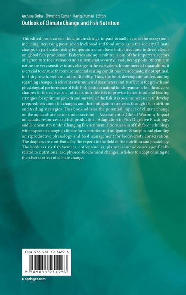 1. The Perspective of climate change on aquatic environment and fish production.- 2. Climate Change: Stressor on Marine Buffer System.- 3. Climate Change: Impact on Fauna and Fishing Activity 0f River.- 4. Possible Impact of Climate Change on Fisheries.- 5. Impact of global warming on changing pattern of biodiversity and fish production in inland open waters.- 6. Climate Change and Coral Reef Ecosystem: Impacts and Management Strategies.- 7. Implications of Climate Change on Fisheries and Food Security.- 8. Nexus of climate change with fish production and its implications on livelihood and nutritional security.- 9. Gut microbes and its physiological role in fish: adaptive strategies for climatic variability.- 10. Metabolic adaptation of fishes under different consequences of climate change.- 11. Argulus Parasitism in Aquaculture: An Elevated Temperature Scenario.- 12. Effect of environmental variability on the pigmentation ofFishes.- 13. Climate Change and stress Response in Teleost. 14. Impact of Climate Change on Emergence of Biotoxin in Fish and Shellfish.- 15. Metabolomic response to high temperature stress in murrel Channa striatus and insights for designer feeds.- 16. Feed and feeding management for sustainable growth and health of fish in varying climatic condition.- 17. Vulnerability and Mitigation Approach to Nutritional Pathology for Sustainable Fish Growth in Changing Climatic Conditions.- 18. Technology Prioritization For Climate-Resilient Nutritive Fish.- 19. Role of Dietary supplements in stress amelioration of teleost fishes.- 20. Dealing the hardship in aquaculture nutrition in a changing climatic condition.- 21. Strategies to mitigate climate change-imposed challenges in fish nutrition.- 22. Duckweed-based circular aquaculture for climate resilience and carbon foot-print reduction of fed Aquaculture.- 23. Nutraceuticals in aquaculture:a prospective climate change adaptation strategy.- 24. Broodstock development, induced breeding, and seed production of climbing perch Anabas testudineus: An alternative aquaculture species for changing environment.- 25. Effect of changing environmental factors on reproductive cycle and endocrinology of fishes.- 26. Impact of climate change on fish reproduction and climate-resilient broodstock management.- 27. Nutrition and environment interactions in aquaculture.- 28. Reproductive and maternal nutrition in changing climatic conditions.