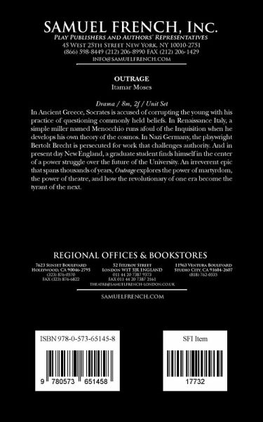 Drama Characters: 8 male, 2 female Unit Set In Ancient Greece, Socrates is accused of corrupting the young with his practice of questioning commonly held beliefs. In Renaissance Italy, a simple miller named Menocchio runs afoul of the Inquisition when he develops his own theory of the cosmos. In Nazi Germany, the playwright Bertolt Brecht is persecuted for work that challenges authority. And in present day New England, a graduate student finds himself in the center of a power struggle over the future of the University. An irreverent epic that spans thousands of years, Outrage explores the power of martyrdom, the power of theatre, and how the revolutionary of one era become the tyrant of the next.