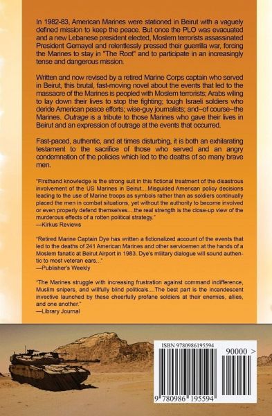 In 1982-83, American Marines were stationed in Beirut with a vaguely defined mission to keep the peace. But once the PLO was evacuated and a new Lebanese president elected, Moslem terrorists assassinated President Gemayel and relentlessly pressed their guerrilla war, forcing the Marines to stay in "The Root" and to participate in an increasingly tense and dangerous mission. Written and now revised by a retired Marine Corps captain who served in Beirut, this brutal, fast-moving novel about the events that led to the massacre of the Marines is peopled with Moslem terrorists; Arabs wiling to lay down their lives to stop the fighting; tough Israeli soldiers who deride American peace efforts; wise-guy journalists; and--of course--the Marines. Outrage is a tribute to those Marines who gave their lives in Beirut and an expression of outrage at the events that occurred. Fast-paced, authentic, and at times disturbing, it is both an exhilarating testament to the sacrifice of those who served and an angry condemnation of the policies which led to the deaths of so many brave men.