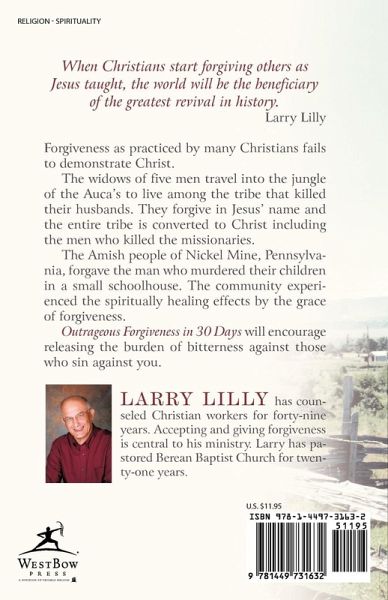 When Christians start forgiving others as Jesus taught, the world will be the beneficiary of the greatest revival in history. Larry Lilly Forgiveness as practiced by many Christians fails to demonstrate Christ. The widows of five men travel into the jungle of the Auca’s to live among the tribe and men who killed their husbands. They forgive in Jesus’ name the entire tribe is converted to Christ including the men who killed the missionaries. The Amish people of Nickel Mine, Pennsylvania, forgave the man who murdered their children in a small schoolhouse. The community experienced the spiritually healing effects by the grace of forgiveness. Outrageous Forgiveness in 30 Days, will encourage releasing the burden of bitterness against those who sin against you.