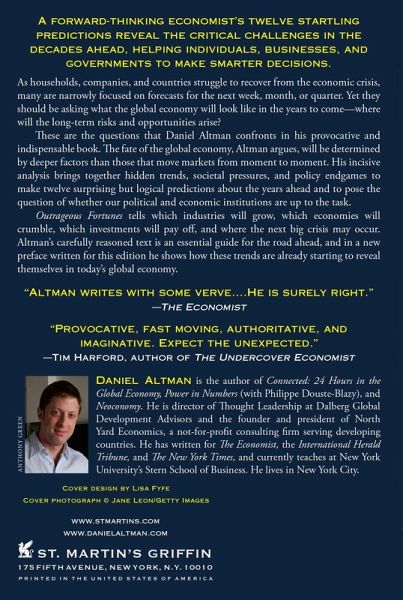 "Informative and accessible, penetrating and provocative. . . . A first-rate guide to global trends." -NPR.org As individuals, companies, and countries struggle to recover from the economic crisis, many are narrowly focused on forecasts for the next week, month, or quarter. Yet they should be asking what the global economy will look like in the years to come-where will the long-term risks and opportunities arise? These are the questions that Daniel Altman confronts in his provocative and indispensable book. The fate of the global economy, Altman argues, will be determined by deeper factors than those that move markets from moment to moment. His incisive analysis brings together hidden trends, societal pressures, and policy endgames to make twelve surprising but logical predictions about the years ahead and to pose the question of whether our political and economic institutions are up to the task. Outrageous Fortunes tells which industries will grow, which economies will crumble, which investments will pay off, and where the next big crisis may occur. Altman's carefully reasoned text is an essential guide for the road ahead, and in a new preface written for this edition, he shows how these trends are revealing themselves in today's global economy.