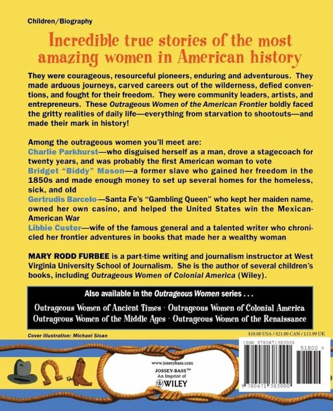 Incredible true stories of the most amazing women in American history They were courageous, resourceful pioneers, enduring and adventurous. They made arduous journeys, carved careers out of the wilderness, defied conventions, and fought for their freedom. They were community leaders, artists, and entrepreneurs. These Outrageous Women of the American Frontier boldly faced the gritty realities of daily life?everything from starvation to shootouts?and made their mark in history! Among the outrageous women you?ll meet are: * Charlie Parkhurst?who disguised herself as a man, drove a stagecoach for twenty years, and was probably the first American woman to vote * Bridget "Biddy" Mason?a former slave who gained her freedom in the 1850s and made enough money to set up several homes for the homeless, sick, and old * Gertrudis Barcelo?Santa Fe's "Gambling Queen" who kept her maiden name, owned her own casino, and helped the United States win the Mexican-American War * Libbie Custer?wife of the famous general and a talented writer who chronicled her frontier adventures in books that made her a wealthy woman Also available in the Outrageous Women series... * Outrageous Women of Ancient Times * Outrageous Women of Colonial America * Outrageous Women of the Middle Ages * Outrageous Women of the Renaissance