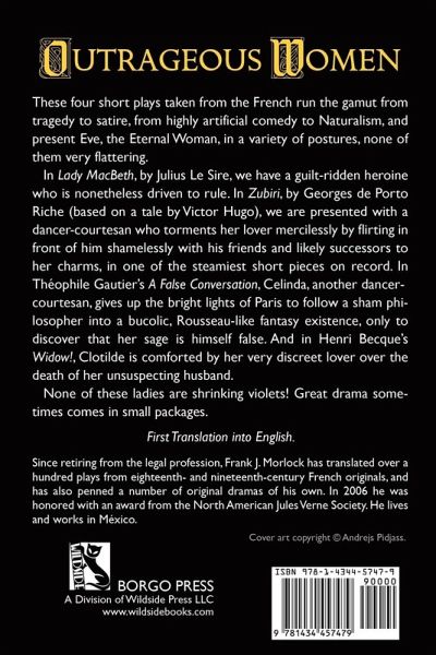 These four short French plays run the gamut from tragedy to satire, from highly artificial comedy to Naturalism, and present Eve, the Eternal Woman, in a variety of poses, none of them very flattering. Contents: Lady MacBeth, by Julius Le Sire; Zubiri, by Georges de Porto Riche, based on a tale by Victor Hugo; A False Conversation, by Théophile Gautier; and Widow!, by Henri Becque. None of these ladies are shrinking violets! Great drama in small packages.