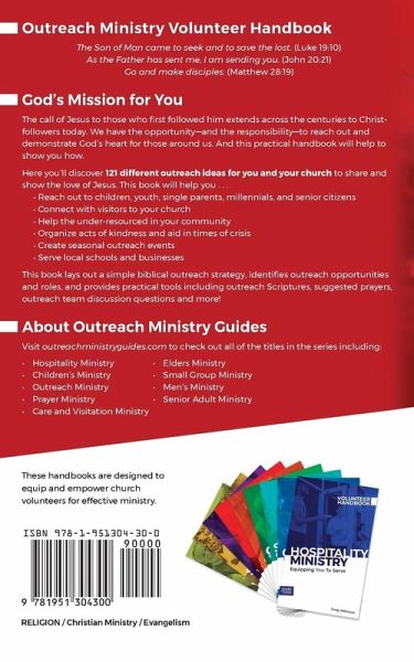 Practical Outreach Ideas and Ministry Tools Never has there been a greater need to share the good news of God's love with those in our communities. This compact handbook shows how individual Christians and ministry teams can share the gospel by reaching out to and serving others. Featuring 121 outreach ideas, this book helps to equip ministry teams with practical tools to serve families, children, youth, seniors, first responders, the oppressed and under resourced, millennials, single parents, local schools and businesses, and more! Designed for ministry volunteers, the book is a compact handbook of outreach ministry helps which, in addition to the dozens of outreach ideas, also include outreach Scriptures and prayers, ways to share your faith, team discussion questions, and recommended outreach ministries and resources. This helpful little book is a great resource for equipping outreach ministry volunteers to serve others and to share the good news!