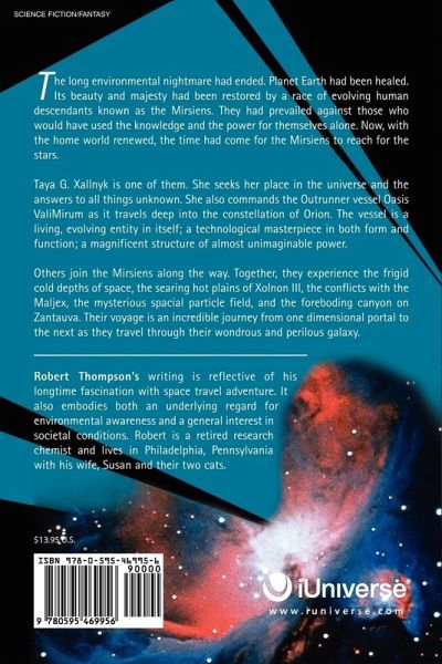 The long environmental nightmare had ended. Planet Earth had been healed. Its beauty and majesty had been restored by a race of evolving human descendants known as the Mirsiens. They had prevailed against those who would have used the knowledge and the power for themselves alone. Now, with the home world renewed, the time had come for the Mirsiens to reach for the stars. Taya G. Xallnyk is one of them. She seeks her place in the universe and the answers to all things unknown. She also commands the Outrunner vessel Oasis ValiMirum as it travels deep into the constellation of Orion. The vessel is a living, evolving entity in itself; a technological masterpiece in both form and function; a magnificent structure of almost unimaginable power. Others join the Mirsiens along the way. Together, they experience the frigid cold depths of space, the searing hot plains of Xolnon III, the conflicts with the Maljex, the mysterious spacial particle field, and the foreboding canyon on Zantauva. Their voyage is an incredible journey from one dimensional portal to the next as they travel through their wondrous and perilous galaxy.