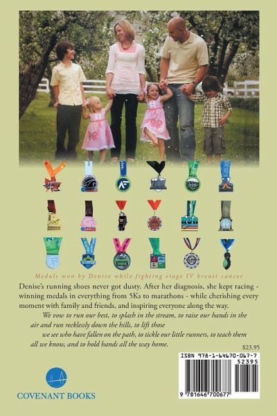 Denise's running shoes never got dusty. After her diagnosis, she kept racing - winning medals in everything from 5Ks to marathons - while cherishing every moment with family and friends, and inspiring everyone along the way. "We vow to run our best, to splash in the stream, to raise our hands in the air and run recklessly down the hills, to lift those we see who have fallen on the path, to tickle our little runners, to teach them all we know, and to hold hands all the way home."