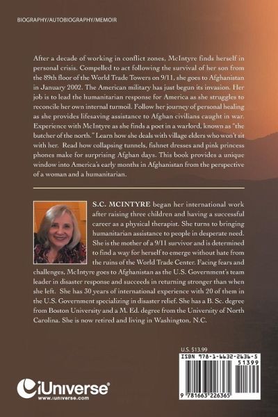 After a decade of working in conflict zones, McIntyre finds herself in personal crisis. Compelled to act following the survival of her son from the 89th floor of the World Trade Towers on 9/11, she goes to Afghanistan in January 2002. The American military has just begun its invasion. Her job is to lead the humanitarian response for America as she struggles to reconcile her own internal turmoil. Follow her journey of personal healing as she provides lifesaving assistance to Afghan civilians caught in war. Experience with McIntyre as she finds a poet in a warlord, known as "the butcher of the north." Learn how she deals with village elders who won't sit with her. Read how collapsing tunnels, fishnet dresses and pink princess phones make for surprising Afghan days. This book provides a unique window into America's early months in Afghanistan from the perspective of a woman and a humanitarian.