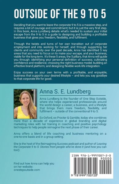 Anna Lundberg is the founder of One Step Outside, where she helps experienced professionals around the world design a career, a business and a lifestyle that brings them more freedom, flexibility, and fulfilment - outside of the conventional 9 to 5.Voted 'most likely to succeed' and graduating top of her class aged 17, Anna studied Philosophy, Politics and Economics at the University of Oxford and then continued on to do a post-graduate degree in International Relations at the Graduate Institute of International Studies in Geneva.Having 'ended up' in corporate marketing after her studies, she spent the formative years of her career in beauty and luxury brand management. Leaving her role at multinational Procter & Gamble to start her own company in 2013, she began her new entrepreneurial path by providing digital marketing consulting to well-known brands like Burberry through to exciting new start-ups and solopreneurs.Anna now combines her decade of experience in corporate marketing with her training in coaching and positive psychology techniques to help people reimagine the next phase of their career, with a blend of life coaching and business mentoring.She is the host of the Reimagining Success podcast and author of Leaving the Corporate 9 to 5 and Outside of the 9 to 5.