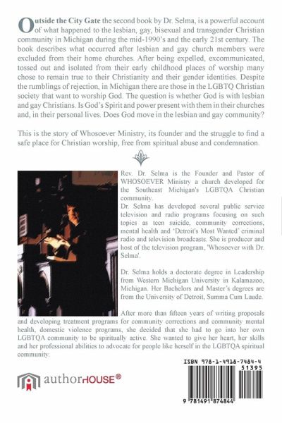 Outside the City Gate the second book by Dr. Selma, is a powerful account of what happened to the lesbian, gay, bisexual and transgender Christian community in Michigan during the mid-1990's and the early 21st century. The book describes what occurred after lesbian and gay church members were excluded from their home churches. After being expelled, excommunicated, tossed out and isolated from their early childhood places of worship many chose to remain true to their Christianity and their gender identities. . Despite the rumblings of rejection, in Michigan there are those in the LGBTQ Christian society that want to worship God. The question is whether God is with lesbian and gay Christians. Is God Spirit and power present with them in their churches and, in their personal lives. Does God move in the lesbian and gay community. This is the story of Whosoever Ministry, its founder and the struggle to find a safe place for Christian worship, free from spiritual abuse and condemnation.