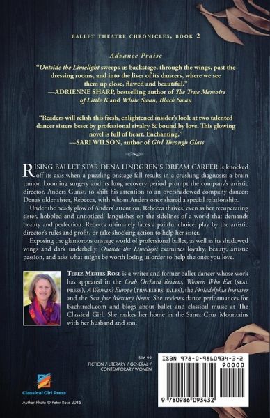 A Kirkus Indie Books of the Month Selection Rising ballet star Dena Lindgren's dream career is knocked off its axis when a puzzling onstage fall results in a crushing diagnosis: a brain tumor. Looming surgery and its long recovery period prompt the company’s artistic director, Anders Gunst, to shift his attention to an overshadowed company dancer: Dena's older sister, Rebecca, with whom Anders once shared a special relationship. Under the heady glow of Anders’ attention, Rebecca thrives, even as her recuperating sister, hobbled and unnoticed, languishes on the sidelines of a world that demands beauty and perfection. Rebecca ultimately faces a painful choice: play by the artistic director’s rules and profit, or take shocking action to help her sister. Exposing the glamorous onstage world of professional ballet, as well as its shadowed wings and dark underbelly, OUTSIDE THE LIMELIGHT examines loyalty, beauty, artistic passion, and asks what might be worth losing in order to help the ones you love. "A lovely and engaging tale of sibling rivalry in the high-stakes dance world." – Kirkus Reviews.