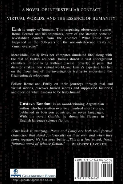 A novel of Interstellar Contact, Virtual Worlds, and the Essence of Humanity. Earth is empty of humans. This surprising observation stymies Rome and his shipmates, crew of the starship come to re-establish contact from the colonies. What could have happened in the 500-years of the non-interference treaty to vanish everyone? Meanwhile, on Earth, Emily is living her computer-simulated life, along with the rest of Earth’s residents: bodies stored in vast underground chambers, minds living without disease, poverty, or pain. But dramatic change is coming to their carefully regulated virtual world. Impenetrable black walls suddenly cut off cities. Monsters appear, destroying all they touch. Emily’s expertise has her on the front line of the investigation, trying to understand these frightening developments. When Rome and Emily meet, it seems they’ve found the answers to each other’s mysteries. But as the colonists and Earth engage in tense diplomacy, suppressed histories are revealed, and a tyrant with frightening powers rises. Together, Rome and Emily discover the terrifying secret buried deep underground that threatens the existence of everyone on Earth. Guatavo Bodoni is an award-winning Argentinian author who has written over a hundred short stories published in fourteen countries, in seven languages. With his novel, Outside, he shows his fluency with English language science fiction. "This book is amazing...Rome and Emily are both very well formed characters that stand fantastically on their own and when they come together, it's just even better...This is a fast paced, fresh, fantastic work of science fiction." --Readers' Favorite