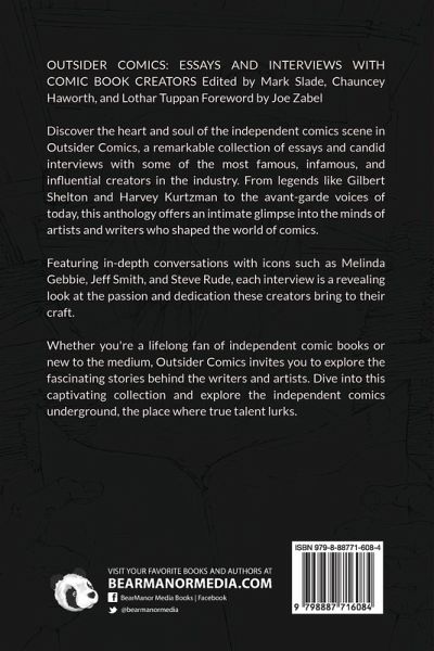OUTSIDER COMICS: ESSAYS AND INTERVIEWS WITH COMIC BOOK CREATORS Edited by Mark Slade, Chauncey Haworth, and Lothar Tuppan Foreword by Joe Zabel Discover the heart and soul of the independent comics scene in Outsider Comics, a remarkable collection of essays and candid interviews with some of the most famous, infamous, and influential creators in the industry. From legends like Gilbert Shelton and Harvey Kurtzman to the avant-garde voices of today, this anthology offers an intimate glimpse into the minds of artists and writers who shaped the world of comics. Featuring in-depth conversations with icons such as Melinda Gebbie, Jeff Smith, and Steve Rude, each interview is a revealing look at the passion and dedication these creators bring to their craft. Whether you're a lifelong fan of independent comic books or new to the medium, Outsider Comics invites you to explore the fascinating stories behind the writers and artists. Dive into this captivating collection and explore the independent comics underground, the place where true talent lurks.