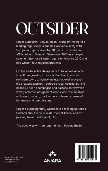 Roger Lundgren, "Royal Roger", is one of the world's leading royal experts and has worked closely with European royal houses for 20 years. He has been affiliated with Swedish Television (SVT) as an expert commentator for all major royal events since 2010 and has written four royal biographies.On the surface, his life appears to be a dream come true. From growing up as a bullied boy in a small northern town, to achieving international success in his greatest passion - Europe's royal houses. But life hasn't all been champagne and palaces. Interwoven with glamorous assignments and close relationships with world royalty, his life has contained streaks of darkness and deep trauma. Roger's autobiography Outsider is a moving yet hopeful book about rape, suicide, mental illness, and the journey toward a life of dignity. The book was written together with Paulina Bylén.
