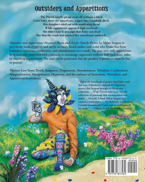 Outsiders and Apparitions: Possessed Poems and Art for Family Picnics by Milan Sergent is an eclectic book of poetry and art by an easily bored author and artist who broke free from boundary violations, conformity, and abandonment as a youth. The past now only apparitions: he is currently possessed with a mission to encourage expression without dull traditions, rules, or shackling expectations. The soul can be possessed, but the product it produces must be free to protest. Themes: Lost Years, Death, Judgment, Dogmatism, Abandonment, Tribalism, Conformism, Marginalization, Manipulation, Hypocrisy, and the embrace of Surrealism, Absurdism, and Apparitions as antidotes.