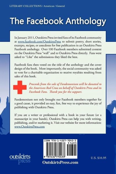 The Facebook Anthology In January 2011, Outskirts Press invited fans of its Facebook community at www.facebook.com/OutskirtsPress to submit poetry, short stories, excerpts, recipes, or anecdotes for free publication in an Outskirts Press Facebook anthology. Over 100 Facebook members submitted content on the Outskirts Press "wall" and to Outskirts Press directly. Fans were asked to "Like" the submissions they liked the best. Facebook fans then voted on the title of the anthology and the cover design of the book. More importantly, the social community was asked to vote for a charitable organization to receive royalties resulting from sales of this book. The American Red Cross received nearly 50% of the votes. Proceeds from the sale of Fandemonium will be donated to the American Red Cross on behalf of Outskirts Press and its Facebook Fans. Thank you for the support. Fandemonium not only brought our Facebook members together for a good cause, it provided an easy, fun, free way to experience the joy of publishing with Outskirts Press first-hand. If you are a writer or professional with a book in your future (or in your hands), Outskirts Press can help you with writing, publishing, and/or marketing it. Visit our website for more information: www.OutskirtsPress.com About Outskirts Press at OutskirtsPress.com Outskirts Press offers high-quality, full-service self-publishing and book marketing services for writers and professionals who are seeking a cost-effective, fast, and flexible way to publish and distribute their books worldwide. Outskirts Press authors keep 100% of their rights, 100% of their profits, and 100% of the creative control.