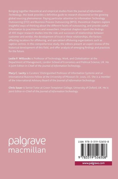 Bringing together theoretical and empirical studies from the Journal of Information Technology, this book provides a definitive guide to research discovered on the growing global sourcing phenomenon. Paying particular attention to Information Technology Outsourcing (ITO) and Business Process Outsourcing (BPO), theoretical chapters explore insightful ways of thinking about the different facets of outsourcing, and provide useful information to practitioners and researchers. Empirical chapters report the findings of 405 major research studies into the risks and successes of relationships between customer and vendor, the development of trust in these relationships, the factors affecting locations for offshoring, and specialized offshoring organizations such as captive centres. In this comprehensive study, the editors present an expert review of the historical development of this field, and offer analysis of emerging findings and practices for the future.