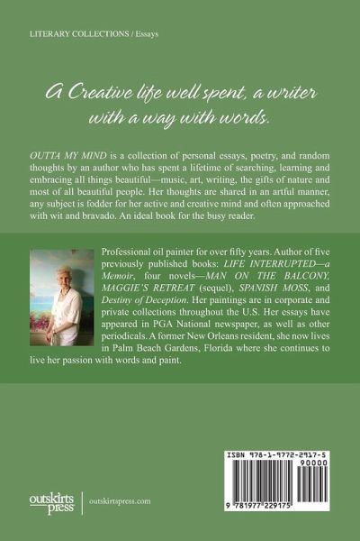 OUTTA MY MIND is a collection of personal essays, poetry, and random thoughts by an author who has spent a lifetime of searching, learning and embracing all things beautiful-music, art, writing, the gifts of nature and most of all beautiful people. Her thoughts are shared in an artful manner, any subject is fodder for her active and creative mind and often approached with wit and bravado. An ideal book for the busy reader.