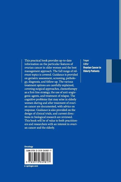 This practical book provides up-to-date information on the particular features of ovarian cancer in older women and the best management approach. The full range of relevant topics is covered. Guidance is provided on geriatric assessment, screening, pathology, diagnosis, and follow-up. The various treatment options are carefully explained, covering surgical approaches, chemotherapy as a first-line strategy, the use of anti-angiogenic agents, and treatment of relapse. The cognitive problems that may arise in elderly women during and after treatment of ovarian cancer are documented, with advice on response. Guidance is also provided on the design of clinical trials, and current directions in biological research are reviewed. This book will be of value to both practitioners and researchers with an interest in ovarian cancer and the elderly.