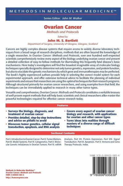 If there is one aspect of current cancer research that represents a major ch- lenge in both novice and experienced researchers, it is the rapid advance in our understanding of the disease. Researchers can be required to switch from analysis of gene expression to kinetics of protein activation, from genetic studies to the analysis of protein funtion. Cancers are highly complex disease systems and researchers aiming to understand the functioning of cancer systems require access to a wide range of laboratory techiques from a broad range of research disciplines. Increasingly, however, published methods are incomplete or refer back to a series of previous publications each containing only a small part of the complete pro- col. The aim of Ovarian Cancer: Methods and Protocols is to provide for ovarian cancer researchers in the first instance, a laboratory handbook that will facilitate research into cancer systems by providing a series of expert protocols, with proven efficacy, across abroad range of technical expertise. Thus, there are sections on tumor genetics and cellular signal transduction, as well as sections on apoptosis and RNA analysis. The value of Ovarian Cancer: Methods and Protocols to the ovarian cancer researcher will, I trust, be considerably enhanced by (1) the provision of a series of overviews relating to the biology, diagnosis, and treatment of this important neoplasm, and (2) the provision of a series of technical overviews introducing each part that provides an expert review of the applications and pitfalls of the various techniques included.