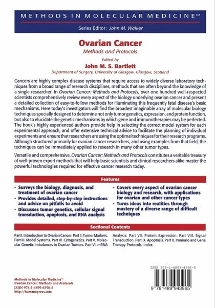 If there is one aspect of current cancer research that represents a major ch- lenge in both novice and experienced researchers, it is the rapid advance in our understanding of the disease. Researchers can be required to switch from analysis of gene expression to kinetics of protein activation, from genetic studies to the analysis of protein funtion. Cancers are highly complex disease systems and researchers aiming to understand the functioning of cancer systems require access to a wide range of laboratory techiques from a broad range of research disciplines. Increasingly, however, published methods are incomplete or refer back to a series of previous publications each containing only a small part of the complete pro- col. The aim of Ovarian Cancer: Methods and Protocols is to provide for ovarian cancer researchers in the first instance, a laboratory handbook that will facilitate research into cancer systems by providing a series of expert protocols, with proven efficacy, across abroad range of technical expertise. Thus, there are sections on tumor genetics and cellular signal transduction, as well as sections on apoptosis and RNA analysis. The value of Ovarian Cancer: Methods and Protocols to the ovarian cancer researcher will, I trust, be considerably enhanced by (1) the provision of a series of overviews relating to the biology, diagnosis, and treatment of this important neoplasm, and (2) the provision of a series of technical overviews introducing each part that provides an expert review of the applications and pitfalls of the various techniques included.