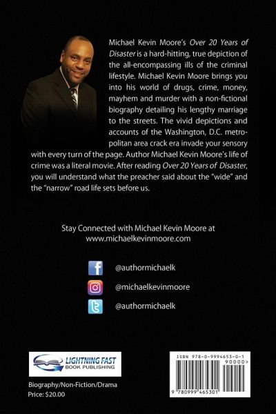 Michael Kevin Moore’s Over 20 Years of Disaster is a hard-hitting, true depiction of the all-encompassing ills of the criminal lifestyle. Michal Kevin Moore brings you into his world of drugs, crime, money, mayhem and murder, with a non-fictional biography detailing his lengthy marriage to the streets. The vivid depictions and accounts of the Washington, D.C. metropolitan area crack era invade your sensory with every turn of the page. Author Michael Kevin Moore’s life of crime was a literal movie. After reading Over 20 Years of Disaster, you will understand what the preacher said about the "wide" and the "narrow" road that life sets before us.