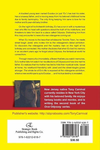 A troubled young teen named Exodus (or just "Ex") has lost his sister, has a runaway father, and is moving away from his beloved childhood home due to family bankruptcy. The only thing keeping him sane is love for his mother and 6-year-old baby brother. On the night of his thirteenth birthday, Ex has a run-in with a mysterious man who fills his head with questions about the truth of his misfortune, and threatens to take him back to a place called Odyssia. Distracting him from this crazy encounter is news of a new videogame coming out. When Ex moves to the less-than-wholesome Toronto Town, he meets street tough Jared, who invites him to the videogame's debut exhibition. Ex discovers the videogame and the mystery man on the night of his birthday are connected. His mother discloses that when Ex lost his memory in an accident years ago he forgot about Odyssia, the fantastical world he comes from. Through means of a chronodelia, a flower that lets you watch memories, Ex's mother lets him watch her recollections of Odyssia and how she met his father. Ex realizes that his mother has lied to hide their mystical roots. Upset at home, his newfound friendship with Jared and the street toughs grows stronger. The whole lie of Ex's life is exposed at the videogame exhibition, where a new world opens up to Exodus ... and his true destiny is revealed. New Jersey native Tony Carnival currently resides in New York City with his beloved family. He enjoys fantasy books and movies, and is writing the second book of the Over Odyssey series. Publisher's website: http://sbprabooks.com/TonyCarnival