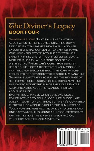 Savanna is alone. That's all she can think about when her life comes crashing down. Her dad isn't taking her news well, and her ex-boyfriend has conveniently skipped town. When diviners swoop into the city with her safety in mind, she isn't completely on board. Neither is her ex, who's more focused on distributing Priori Lab's cure than being by her side. He's got a different plan in mind, one that will hopefully distract the captivators enough to forget about their target. Meanwhile, Savanna's just trying to survive the revenge of her former cheer squad. She is doing anything she can to dodge the rumors her classmates keep spreading about her... about her ex... about her life... Everything changes when someone close to her intends to spill blood. Her blood. She doesn't want to hurt them, but if she's cornered, there will be a fight. Should she run instead? Told from the perspective of eight diviners and one captivator, this young adult contemporary fantasy teeters the lines between magick, prophecy, and teenage adversity.