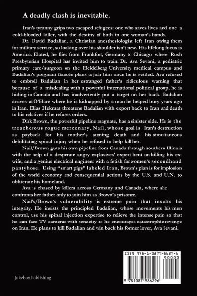 Iran's tyranny grips two escaped refugees: one who saves lives and one a cold-blooded killer, with the destiny of both in one woman's hands.Dr. David Badalian, a Christian anesthesiologist left Iran owing them for military service, so looking over his shoulder isn't new. His lifelong focus is America. Elated, he flies from Frankfort, Germany to Chicago where Rush Presbyterian Hospital has invited him to train. Dr. Ava Sevani, a pediatric primary care/surgeon on the Heidelberg University medical campus and Badalian's pregnant fiancée plans to join him once he is settled. Ava refused to embroil Badalian in her estranged father's ridiculous warning that because of a misdealing with a powerful international political group, he is hiding in Canada and has inadvertently put a target on her back. Badalian arrives at O'Hare where he is kidnapped by a man he helped bury years ago in Iran. Elias Hekmat threatens Badalian with export back to Iran and death to his relatives if he refuses orders.Dirk Brown, the powerful pipeline magnate, has a sinister side. He is the treacherous rogue mercenary, Nail, whose goal is Iran's destruction as payback for his mother's stoning death and his simultaneous debilitating spinal injury when he refused to help kill her. Nail/Brown guts his own pipeline from Canada through southern Illinois with the help of a desperate angry explosives expert bent on killing his ex-wife, and a genius electrical engineer with a fetish for women's secondhand pantyhose. Using "smartpigs" labeled Iran, Brown's plan is for implosion of the world economy and consequential actions by the U.S. and U.N. to obliterate his homeland. Ava is chased by killers across Germany and Canada, where she confronts her father only to join him as Brown's prisoner.Nail's/Brown's vulnerability is extreme pain that insults his integrity. He insists the principled Badalian, whose movements his men control, use his spinal injection expertise to relieve the intense pain so that he can face TV cameras with tenacity as he encourages catastrophic revenge on Iran. He plans to kill Badalian and win back his former lover, Ava Sevani.Their deadly clash is inevitable.