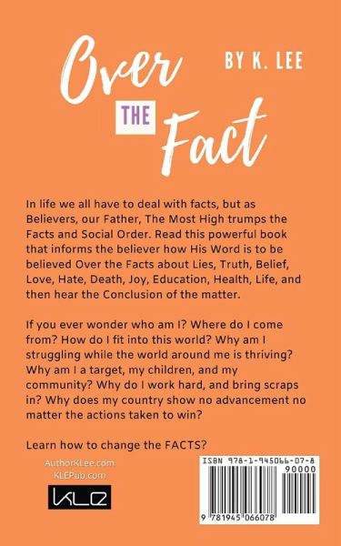 What can we do with our reality? Do we believe? Have faith to change it? Or allow the facts to shape our reality? Faith is the belief in the things that are not yet seen, and to believe in that thing as if it already is. This book is charging your hearts and minds to see the Truth over the Fact of how things are currently.Yes there were once laws passed, that became the fact, but they are now no longer the reality. Facts can change, but Truth will never die. Get this book from K. Lee and read how she outlays the picture of the Truth that always override the Facts!