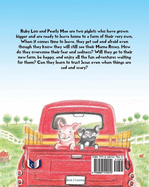 Ruby Loo and Pearly Mae are two piglets who have grown bigger and are ready to leave home to a farm of their very own. When it comes time to leave, they get sad and afraid even though they know they will still see their Mama Rosey. How do they overcome their fear and sadness? Will they go to their new farm, be happy, and enjoy all the fun adventures waiting for them? Can they learn to trust Jesus even when things are sad and scary?