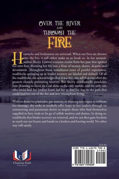 Heartache and brokenness are universal. When our lives are thrown into the fire, it will either make us or break us. In her memoir, author Sherry Lewton recounts events from her past that ignited her own fires, throwing her life into a blaze of secrecy, shame, despair, and devastation. Throughout those tumultuous years of painful experiences, roadblocks springing up to hinder recovery are labeled and defined. Of all the roadblocks, she acknowledges that it was her own self that was often the greatest obstacle preventing recovery. But Sherry unashamedly proclaims how choosing to focus on God alone as the only answer, and the only one who could heal her broken heart, led her to find her way to the path that could lead her out of the fire and into triumphant living. With no desire for platitudes, pat answers, or shaming techniques to infiltrate her message, she seeks to tenderly offer hope to her readers through an unwavering and passionate desire to inspire those who find themselves engulfed in fiery trials to let go of selfish motives and desires. In doing so, roadblocks that hinder recovery are removed, and we can then gain freedom to reach out our hearts and hands to a broken and hurting world. No other way will satisfy.