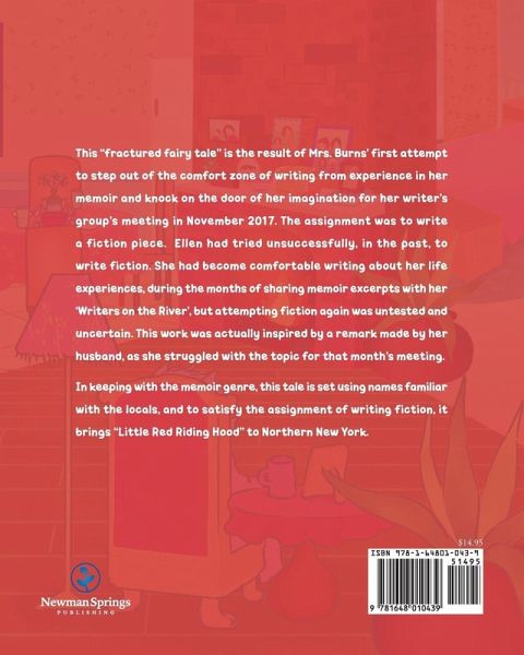 This "fractured fairy tale" is the result of Mrs. Burns' first attempt to step out of the comfort zone of writing from experience in her memoir and knock on the door of her imagination for her writer's group's meeting in November 2017. The assignment was to write a fiction piece. Ellen had tried unsuccessfully, in the past, to write fiction. She had become comfortable writing about her life experiences, during the months of sharing memoir excerpts with her 'Writers on the River', but attempting fiction again was untested and uncertain. This work was actually inspired by a remark made by her husband, as she struggled with the topic for that month's meeting. In keeping with the memoir genre, this tale is set using names familiar with the locals, and to satisfy the assignment of writing fiction, it brings "Little Red Riding Hood" to Northern New York.