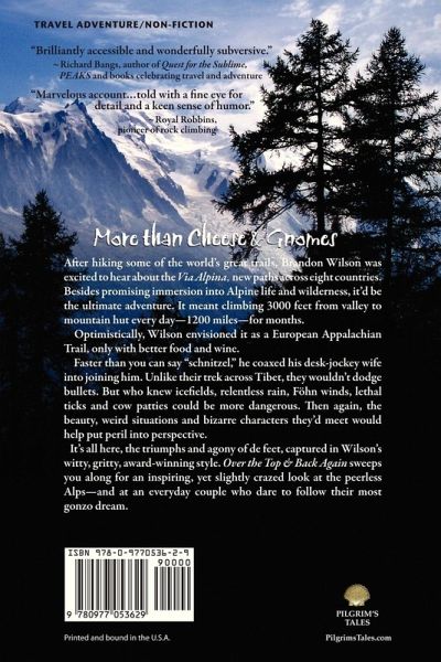 THE FIRST BOOK IN ENGLISH ABOUT A VIA ALPINE THRU-HIKE - Book of the Year Bronze Award 2010 (travel essays category), ForeWord Magazine After hiking some of the world's great trails, Brandon Wilson was excited to hear about the Via Alpina, paths running across eight countries on the backbone of the Alps. Besides promising immersion into Alpine life and wilderness, it was the ultimate adventure. It meant climbing 3000 feet from valley to mountain hut each day-1200 miles-for months. Optimistically, Wilson envisioned it as a European Appalachian Trail, only with better food and wine. Faster than you can say "schnitzel," he coaxed his desk-jockey wife into joining him. Unlike their trek across Tibet, the couple wouldn't dodge bullets. Who knew ice fields, relentless rain, winds, lethal ticks and cow patties could be more dangerous? Then again, the beauty, weird situations and bizarre characters they'd meet would help put peril into perspective. It's all here, the daily triumphs and agony of de feet, captured in Wilson's witty, gritty, award-winning style. "Over the Top & Back Again" sweeps you along for an inspiring, yet slightly crazed look at the peerless Alps-and at an everyday couple who dare to follow their gonzo dream. Written by Brandon Wilson, a Lowell Thomas Award-winning author, it is fourth in his series of true travel adventures. This first Via Alpina travelog published in English includes 53 photos, maps and illustrations by Ken Plumb. Reviews: "This is my favorite kind of adventure tale: Against all odds, in the face of health, weather, interpersonal, navigational and culinary issues, Brandon Wilson and his somewhat reluctant wife hike it because it's there - or, it's supposed to be. I laughed, I winced, and then I started checking to see when I was next scheduled to be anywhere near the Via Alpina." - Kyle Wagner, travel editor, Denver Post "This lighthearted hiking narrative reflects the positives of such an experience: overcoming hardship, laughing at their inability to find trail blazes, Europe's apparent fear of switchbacks on trails ascending 1000-plus meters per col, and the bond and struggle with your trail partner..... Recommended for armchair travelers and anyone interested in hiking the Alps." - Library Journal "Informative, entertaining, and original... a pioneer in a groundbreaking genre of travel writing." - Midwest Book Review "Wilson brings his considerable intellect and wry sense of humor to this epic adventure, and the result is brilliantly accessible and wonderfully subversive." - Richard Bangs, author of Quest for the Sublime and PEAKS "Marvelous account of a long hike...told with a fine eye for detail and a keen sense of humor." - Royal Robbins, legendary rock climber "For outdoor enthusiasts, this book will awaken the travel bug within and inspire adventure. For others, it's a worthwhile armchair journey through beautiful country with friendly guides." - ForeWord Magazine ""Over the Top & Back Again" suggests that maybe a little madness isn't too crazy after all." - WEND Magazine "Wilson walks the way Forrest Gump runs. He's driven to it...As for the connection between the outer journey and the inner journey, Wilson never pushes it. You get it in small bits, as he does, because that's the way it comes. It has a lot to do with savoring the simple pleasures of life that surround us every day. Wilson's books point the way toward this happy state of mind: just be bold and endure a few vicissitudes." - GoNOMAD.com "Makes you want to grab your walking stick, step into your hiking boots and climb a mountain." - Christopher Elliott, syndicated travel writer